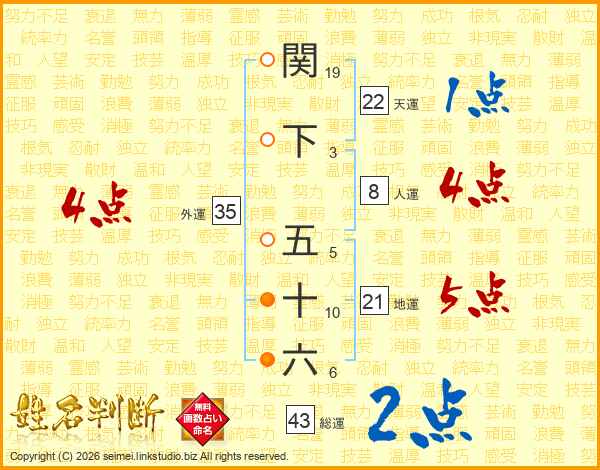 生活面を象徴する運勢です。外部から受ける影響力を表し、結婚運、家庭運や職場、環境への順応性を表します。総運から人運を引いた画数。姓や名が1文字の場合を除く。