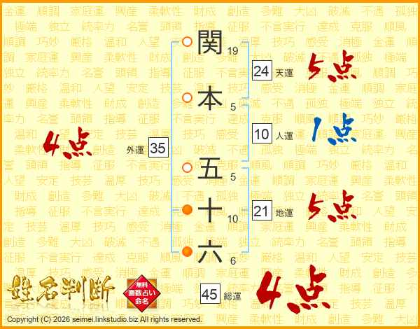 あなたの人生を表す1番重要な運勢です。生涯を通じて影響する総合運となり、主に50歳以降の晩年期に影響を及ぼします。苗字と名前の合計画数。