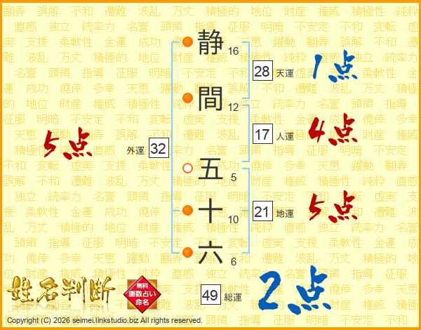 静(16画)間(12画) 五(5画)十(10画)六(6画)
