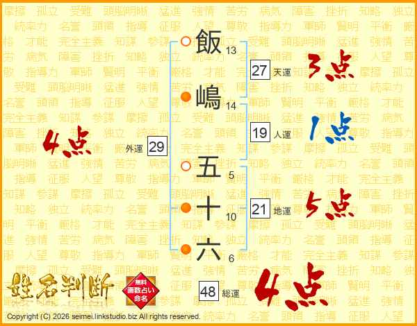 飯(13画)嶋(14画) 五(5画)十(10画)六(6画)