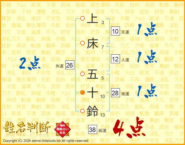 上(3画)床(7画) 五(5画)十(10画)鈴(13画)