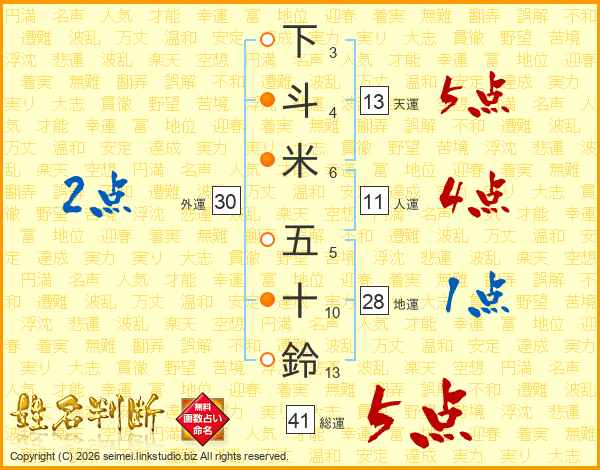 生活面を象徴する運勢です。外部から受ける影響力を表し、結婚運、家庭運や職場、環境への順応性を表します。総運から人運を引いた画数。姓や名が1文字の場合を除く。