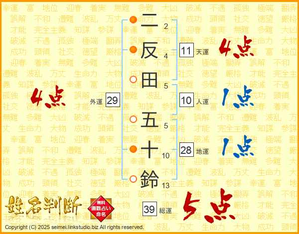 二反田五十鈴さんの総運は39画の5点!