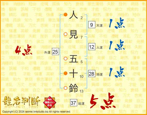 生活面を象徴する運勢です。外部から受ける影響力を表し、結婚運、家庭運や職場、環境への順応性を表します。総運から人運を引いた画数。姓や名が1文字の場合を除く。