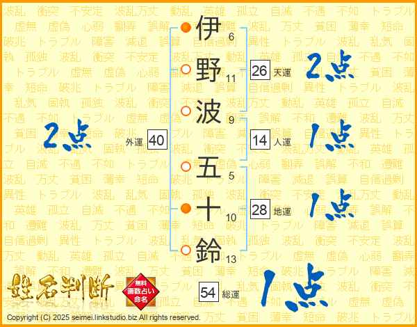 伊(6画)野(11画)波(9画) 五(5画)十(10画)鈴(13画)