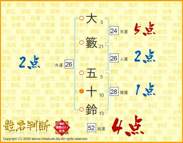 生活面を象徴する運勢です。外部から受ける影響力を表し、結婚運、家庭運や職場、環境への順応性を表します。総運から人運を引いた画数。姓や名が1文字の場合を除く。