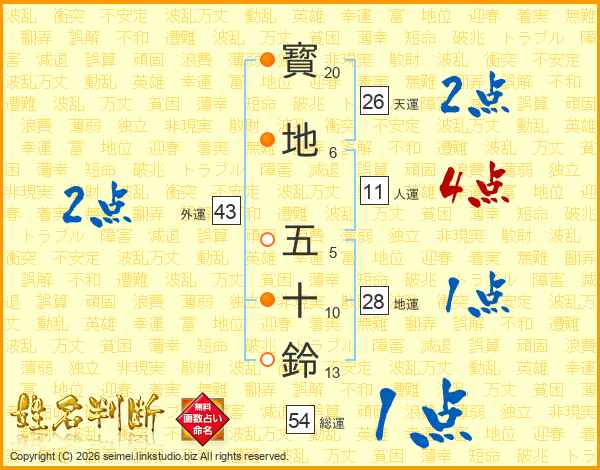生活面を象徴する運勢です。外部から受ける影響力を表し、結婚運、家庭運や職場、環境への順応性を表します。総運から人運を引いた画数。姓や名が1文字の場合を除く。