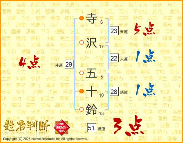 寺(6画)沢(17画) 五(5画)十(10画)鈴(13画)