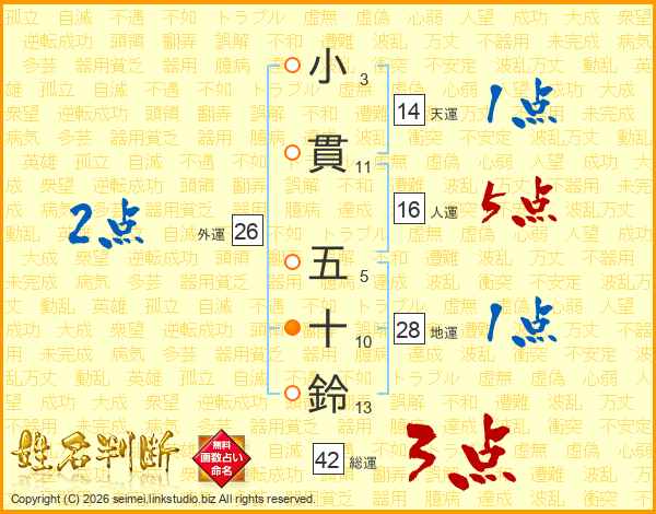 小(3画)貫(11画) 五(5画)十(10画)鈴(13画)