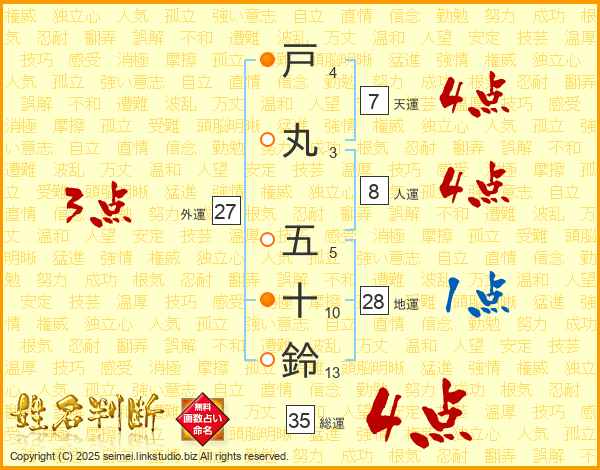 戸(4画)丸(3画) 五(5画)十(10画)鈴(13画)