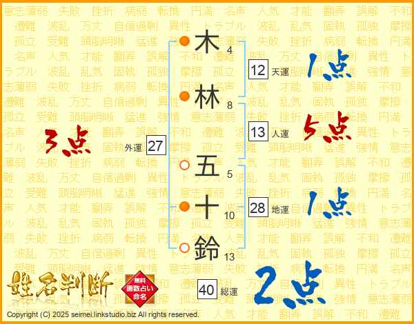 木(4画)林(8画) 五(5画)十(10画)鈴(13画)