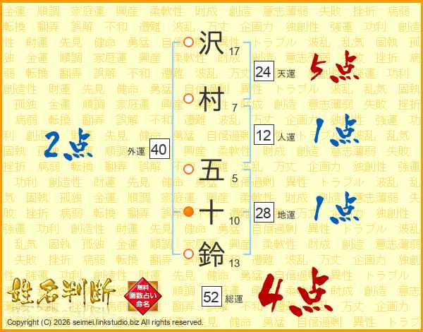 沢(17画)村(7画) 五(5画)十(10画)鈴(13画)