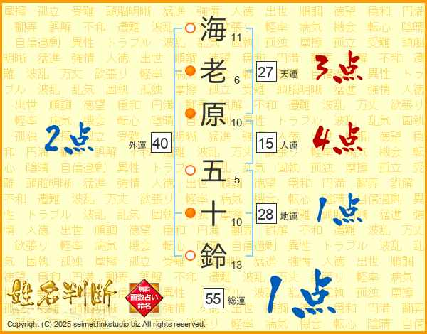 海(11画)老(6画)原(10画) 五(5画)十(10画)鈴(13画)