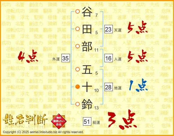 谷(7画)田(5画)部(11画) 五(5画)十(10画)鈴(13画)