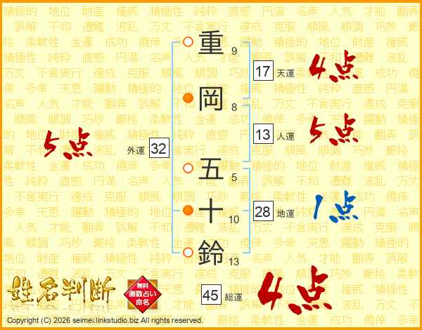 重岡五十鈴さんの総運は45画の4点!