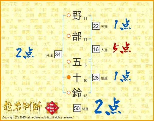 野(11画)部(11画) 五(5画)十(10画)鈴(13画)