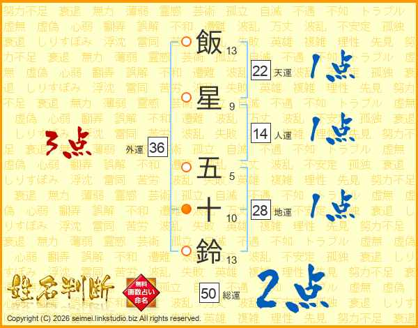 飯(13画)星(9画) 五(5画)十(10画)鈴(13画)