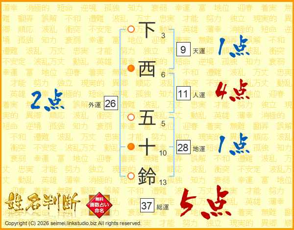 下(3画)西(6画) 五(5画)十(10画)鈴(13画)