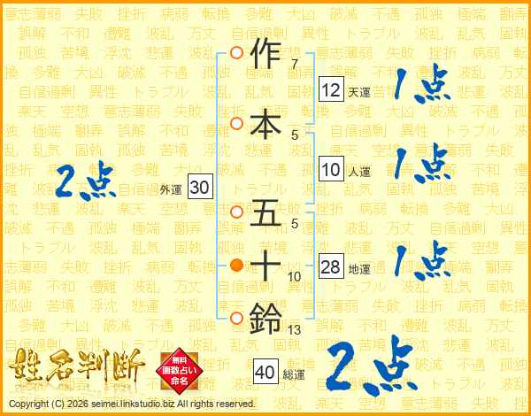 生活面を象徴する運勢です。外部から受ける影響力を表し、結婚運、家庭運や職場、環境への順応性を表します。総運から人運を引いた画数。姓や名が1文字の場合を除く。