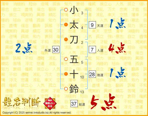 小(3画)太(4画)刀(2画) 五(5画)十(10画)鈴(13画)