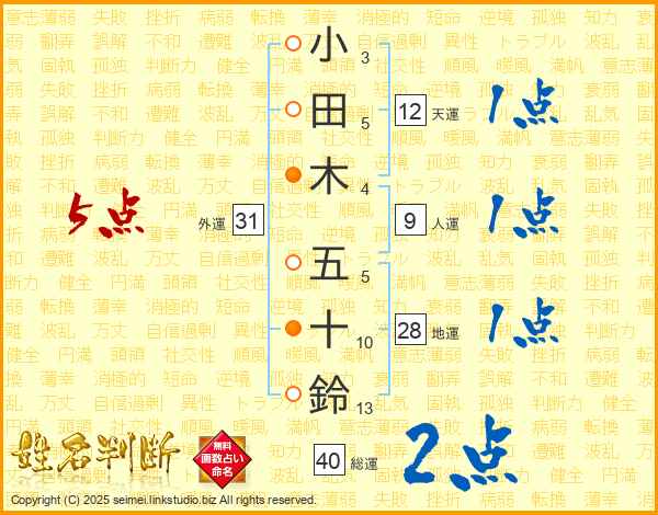 生活面を象徴する運勢です。外部から受ける影響力を表し、結婚運、家庭運や職場、環境への順応性を表します。総運から人運を引いた画数。姓や名が1文字の場合を除く。