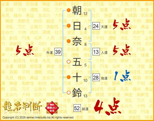 朝(12画)日(4画)奈(8画) 五(5画)十(10画)鈴(13画)
