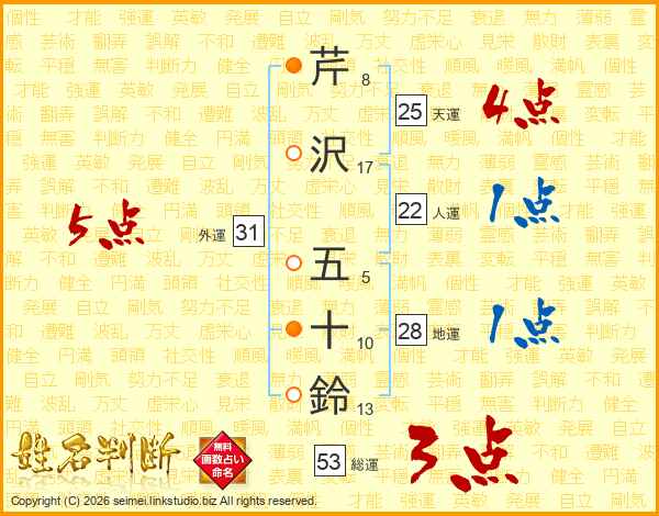 芹(8画)沢(17画) 五(5画)十(10画)鈴(13画)