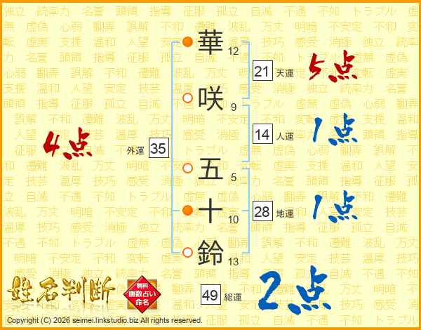 華(12画)咲(9画) 五(5画)十(10画)鈴(13画)