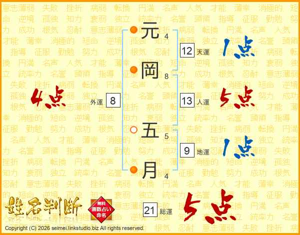 元岡五月さんの総運は21画の5点!