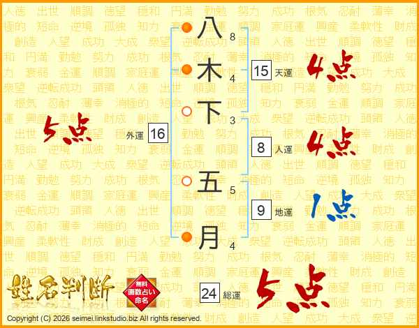 八(8画)木(4画)下(3画) 五(5画)月(4画)