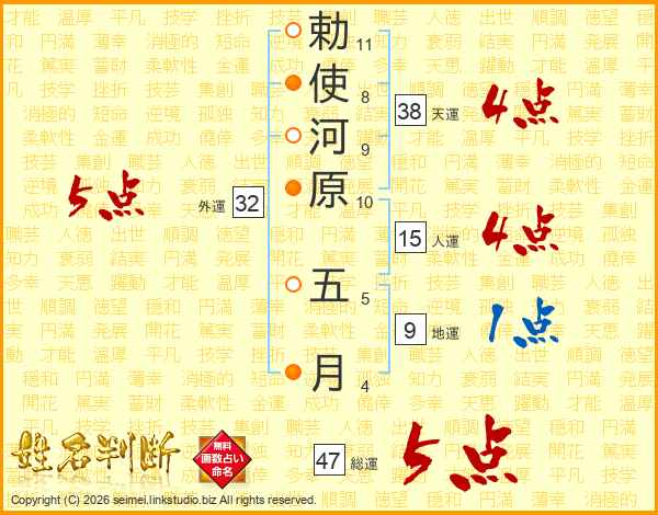 勅(11画)使(8画)河(9画)原(10画) 五(5画)月(4画)