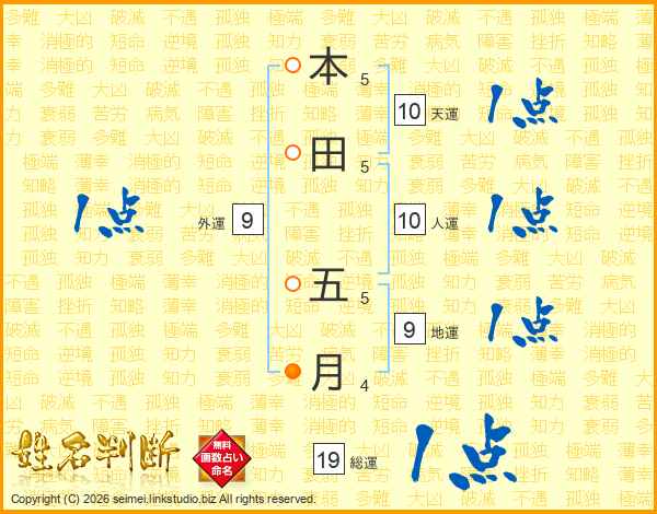 生活面を象徴する運勢です。外部から受ける影響力を表し、結婚運、家庭運や職場、環境への順応性を表します。総運から人運を引いた画数。姓や名が1文字の場合を除く。