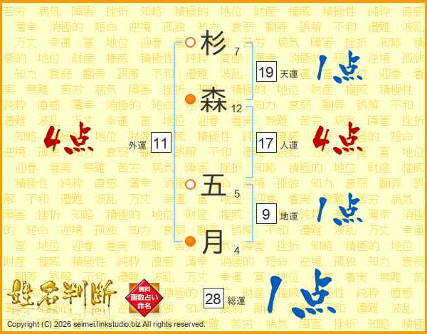 生活面を象徴する運勢です。外部から受ける影響力を表し、結婚運、家庭運や職場、環境への順応性を表します。総運から人運を引いた画数。姓や名が1文字の場合を除く。