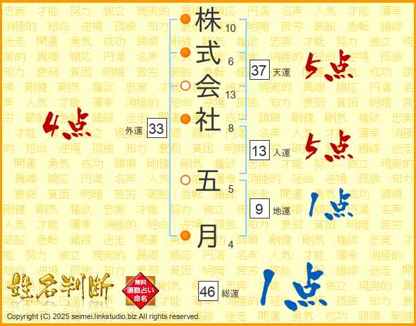 株(10画)式(6画)会(13画)社(8画) 五(5画)月(4画)