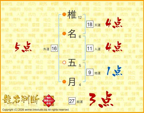 椎名五月さんの総運は27画の3点!