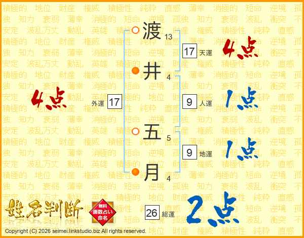 生活面を象徴する運勢です。外部から受ける影響力を表し、結婚運、家庭運や職場、環境への順応性を表します。総運から人運を引いた画数。姓や名が1文字の場合を除く。