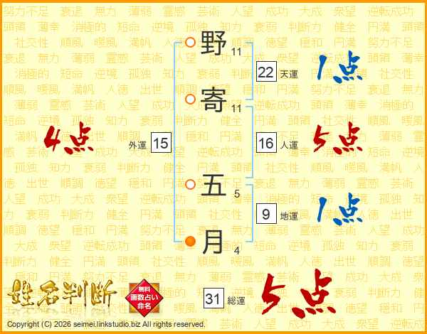 野寄五月さんの総運は31画の5点!