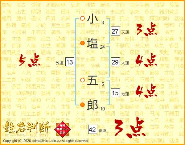 あなたの人生を表す1番重要な運勢です。生涯を通じて影響する総合運となり、主に50歳以降の晩年期に影響を及ぼします。苗字と名前の合計画数。