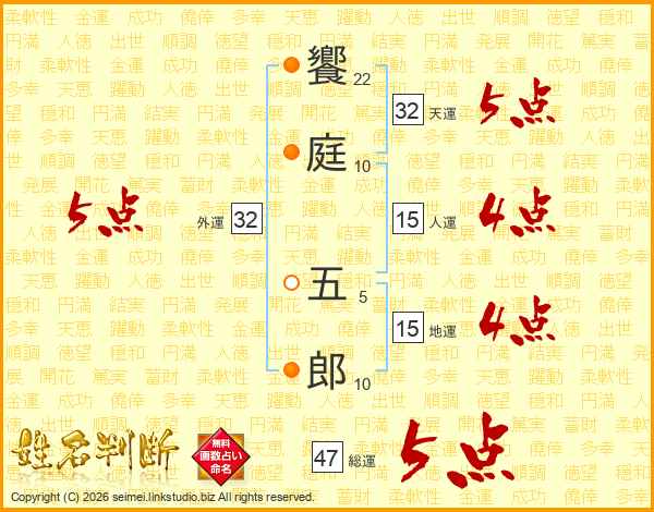 饗(22画)庭(10画) 五(5画)郎(10画)