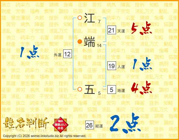 生活面を象徴する運勢です。外部から受ける影響力を表し、結婚運、家庭運や職場、環境への順応性を表します。総運から人運を引いた画数。姓や名が1文字の場合を除く。