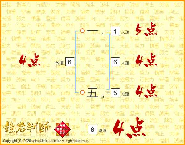 生活面を象徴する運勢です。外部から受ける影響力を表し、結婚運、家庭運や職場、環境への順応性を表します。総運から人運を引いた画数。姓や名が1文字の場合を除く。