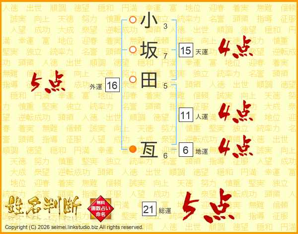 小坂田亙さんの総運は21画の5点!