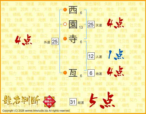 生活面を象徴する運勢です。外部から受ける影響力を表し、結婚運、家庭運や職場、環境への順応性を表します。総運から人運を引いた画数。姓や名が1文字の場合を除く。