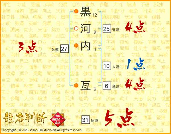 生活面を象徴する運勢です。外部から受ける影響力を表し、結婚運、家庭運や職場、環境への順応性を表します。総運から人運を引いた画数。姓や名が1文字の場合を除く。