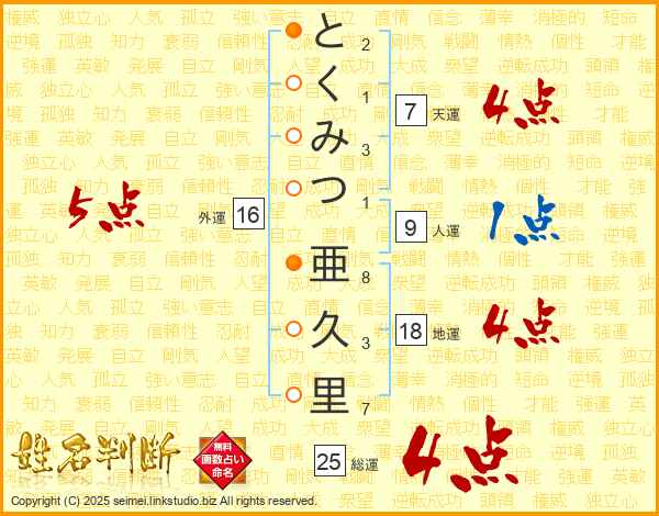 と(2画)く(1画)み(3画)つ(1画) 亜(8画)久(3画)里(7画)