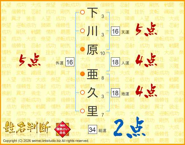 下川原亜久里さんの総運は34画の2点!