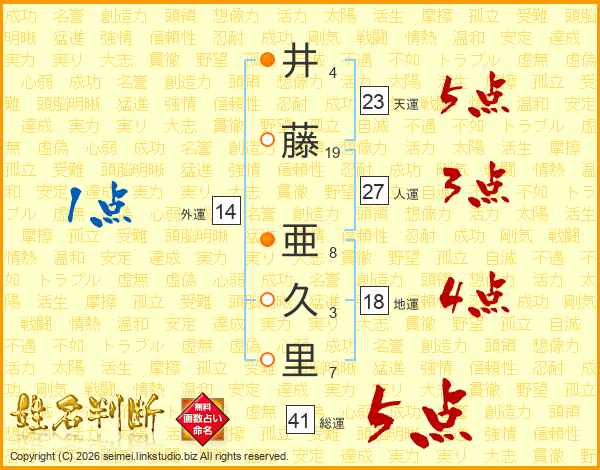 井藤亜久里さんの天運は23画の5点!