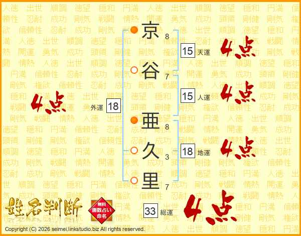 京谷亜久里さんの総運は33画の4点!