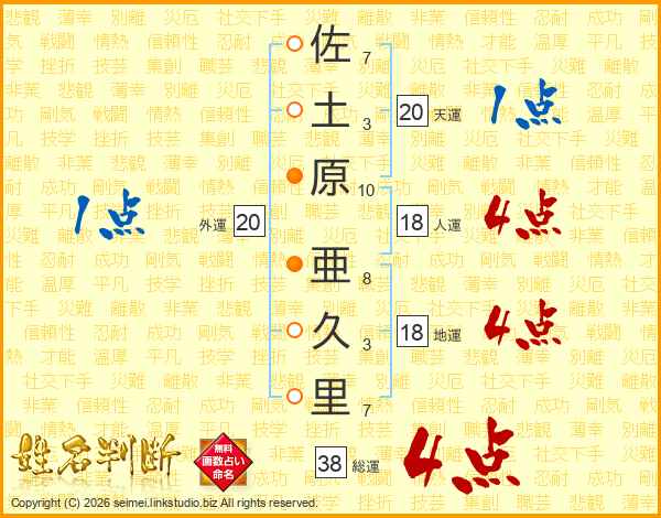 佐(7画)土(3画)原(10画) 亜(8画)久(3画)里(7画)