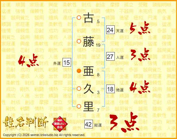 古(5画)藤(19画) 亜(8画)久(3画)里(7画)